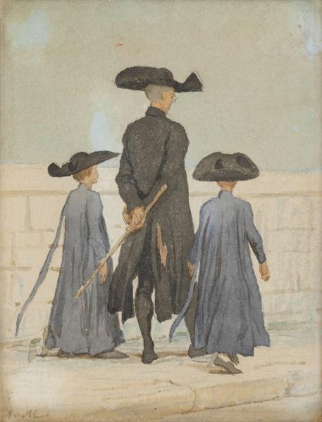 Deux jeunes femmes romaines donnant l'obole à un moine, huile su...