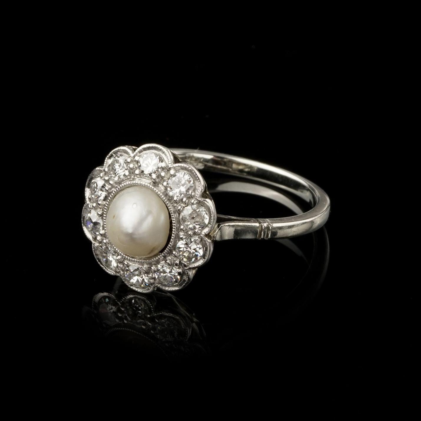 655. Bague marguerite sertie d'une perle entourée de diamant taille ancienne