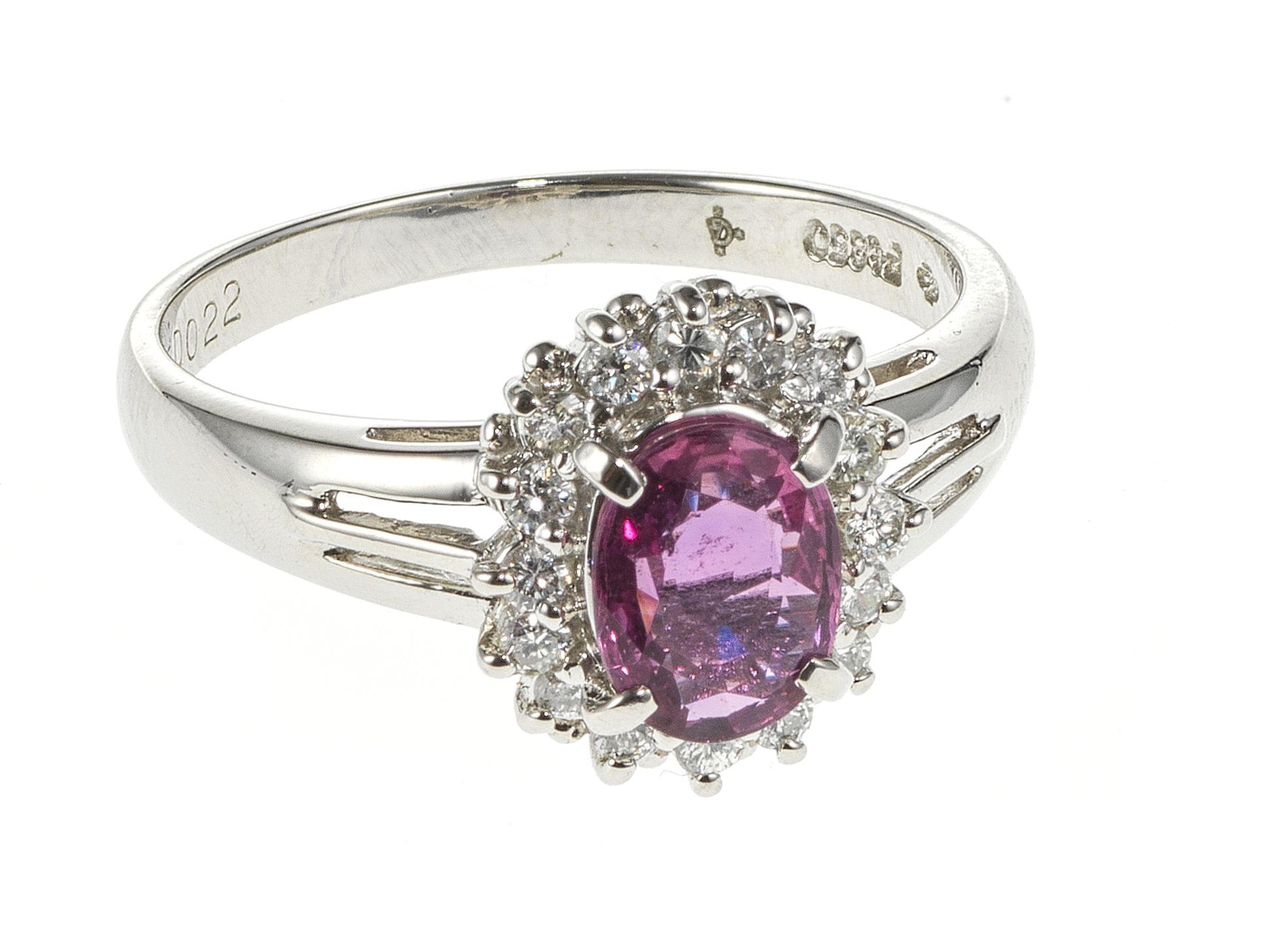 3371. *Bague sertie d'un rubis thaïlandais taille ovale (0,87 ct) entouré de diamants (env. 0,2 ct)