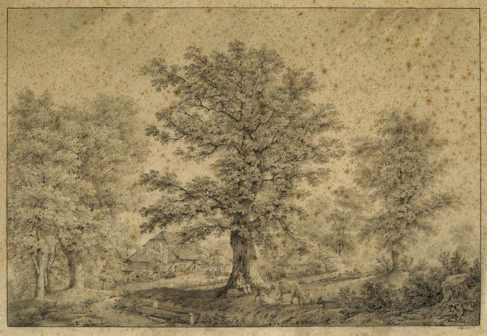 Grands chênes près de la ferme, mine de plomb sur papier, signée, 45x62 cm. Provenance : Château fribourgeois