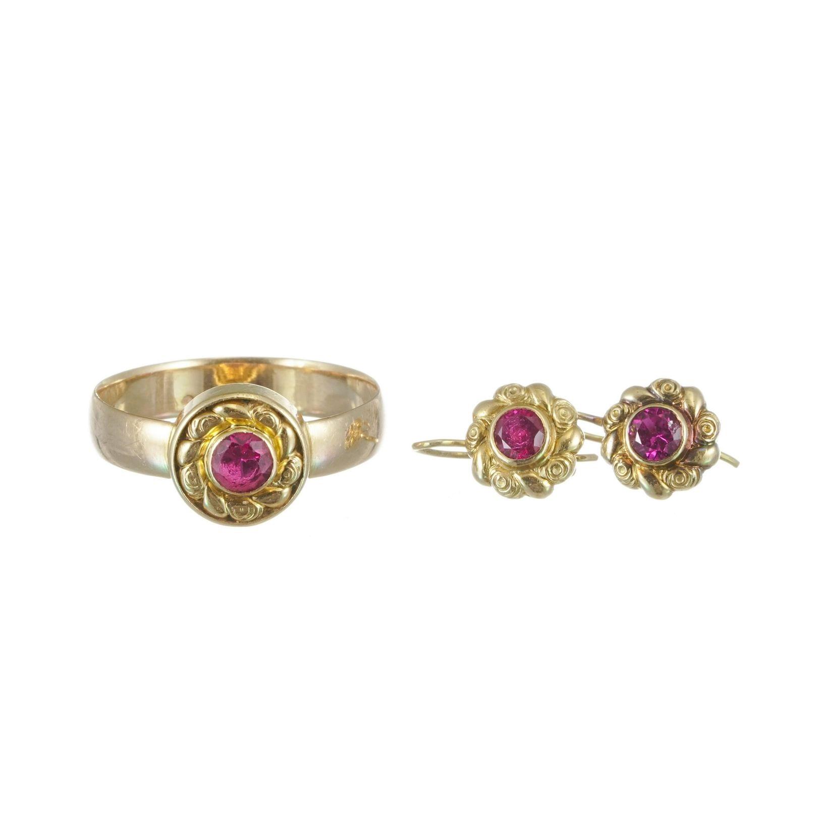 3260. Ensemble d'une bague et de boucles d'oreilles serties de rubis synthétiques taille brillant