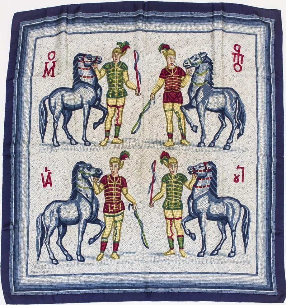 3035. Hermès, foulard à décor de mosaïque romaine représentant quatre cavaliers sur fond blanc et bleu