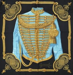 L'un "Brandebourg" sur fond noir, l'autre "Cannes & Pommeaux" à bordure bordeaux et le troisième à décor d'oiseaux violets et roses, soie, env. 86x86 cm