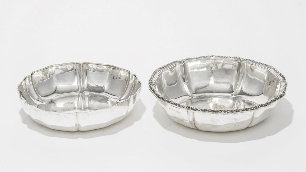 155. Ecuelle ovale couverte sur présentoir de style Louis XV à bordur...