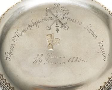 97. Kovsh à décor d'entrelacs et d'un médaillon illustrant un coq et de l'inscription "Прадеды наши пили просто / да жили на свете лет со сто" (Nos ancêtres buvaient facilement et ont atteint cent ans), dédicacé et daté sous la base: "Приз С[анкт] Петербургского Речного Яхт клуба / 22 Июня - 4 июля 1880 г." (Prix du Yacht Club de Saint Petersbourg, 22 juin - 4 juillet 1880), Pavel Ovchinnikov, privilège impérial, contrôle Moscou, 1872, L 12 cm, 220g