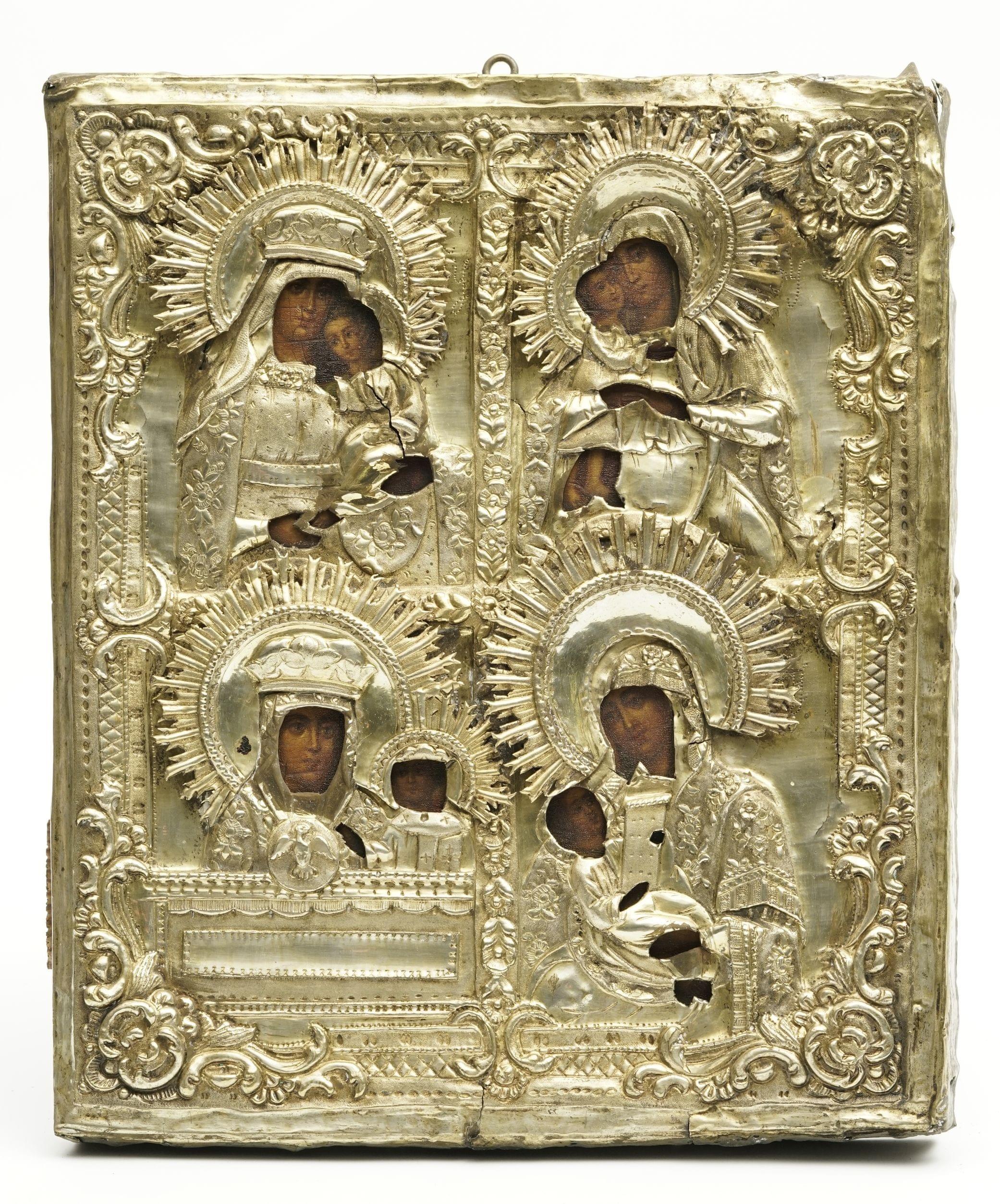 Icône sur panneau à oklade néoclassique en argent, 84 zolotniks,...