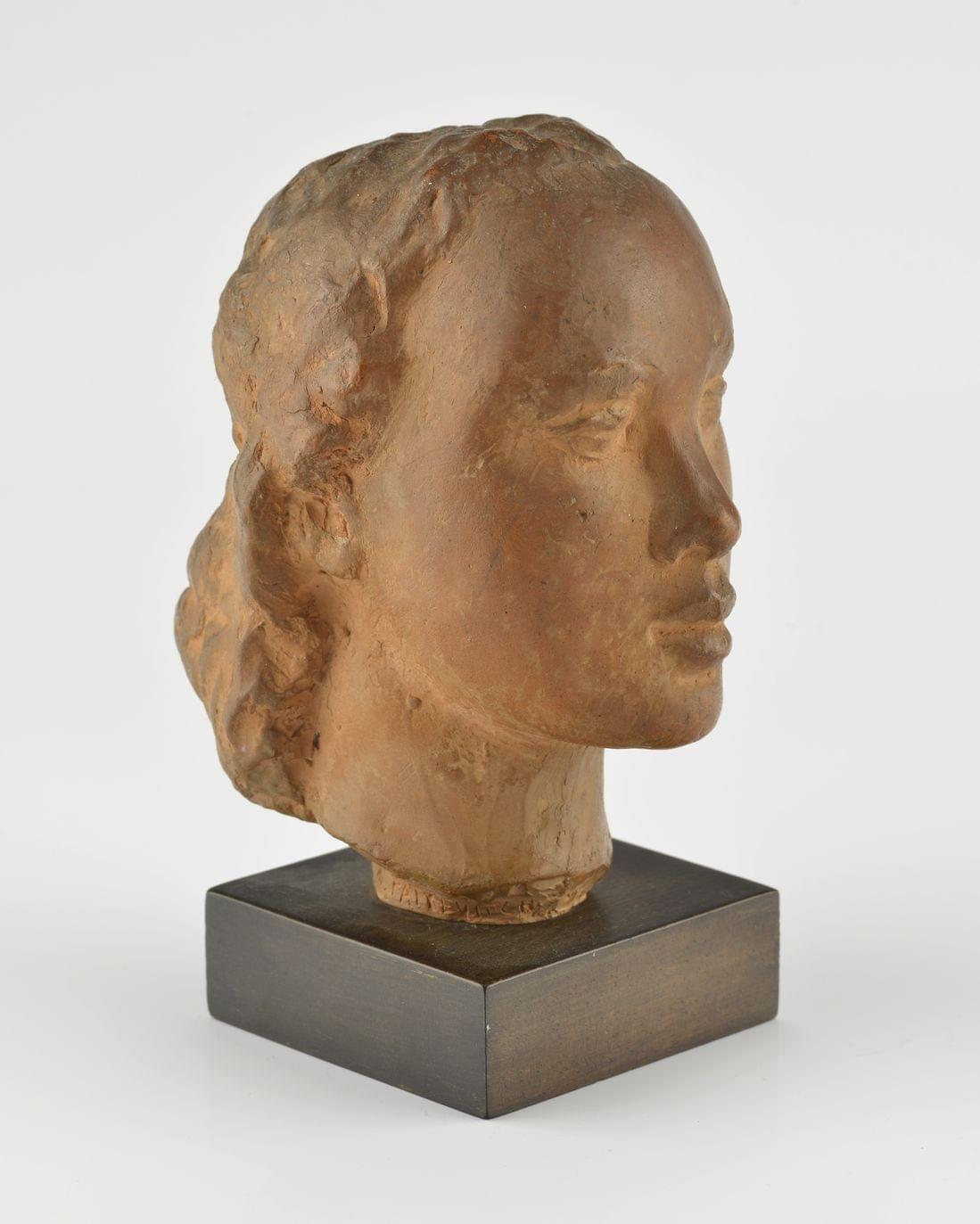 Tête de femme, sculpture en terre cuite ocre, vers 1940, signée à la base du cou, socle en bois, H17 cm