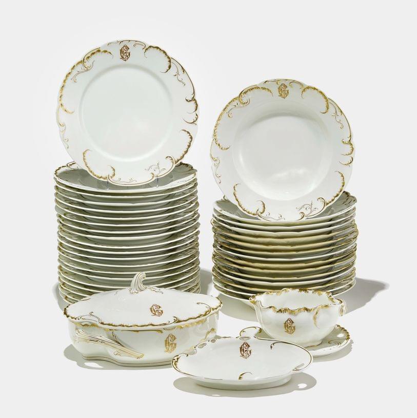 Service à dîner à bordure ornée de rocailles dorées et monogrammée LC Haviland, Limoges, porcelaine, comprenant: 18 assiettes à dîner, 18 à dessert, 12 creuses et 12 pièces de service (60p)