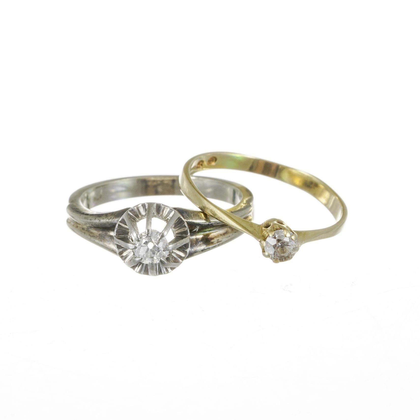 Or gris 750, doigt 52-12, 4 g. On joint un solitaire en or 750 serti d'une pierre d'imitation pour le diamant, doigt 53-13.