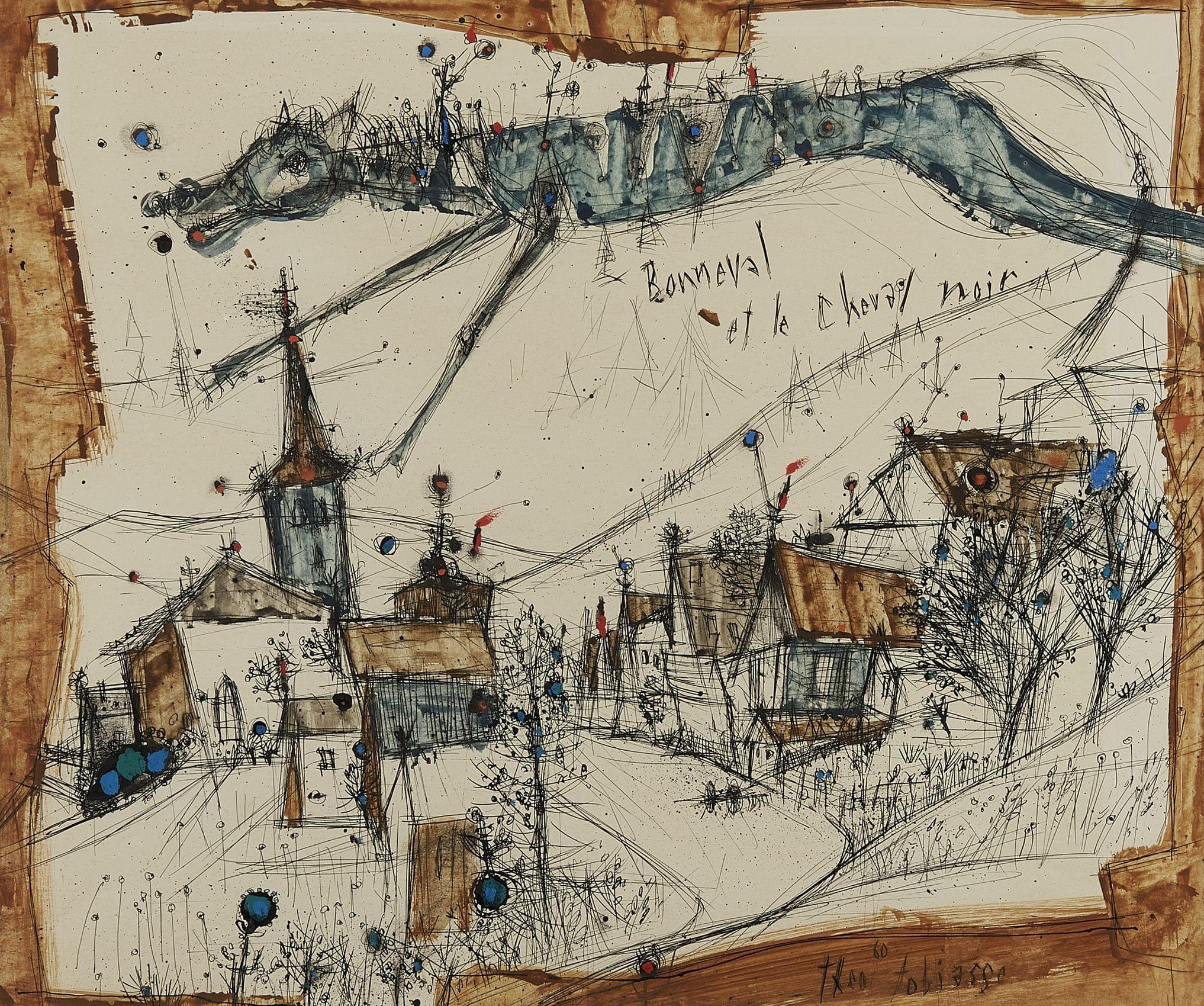 Bonneval et le cheval noir, plume et gouache sur papier, 40x50 cm