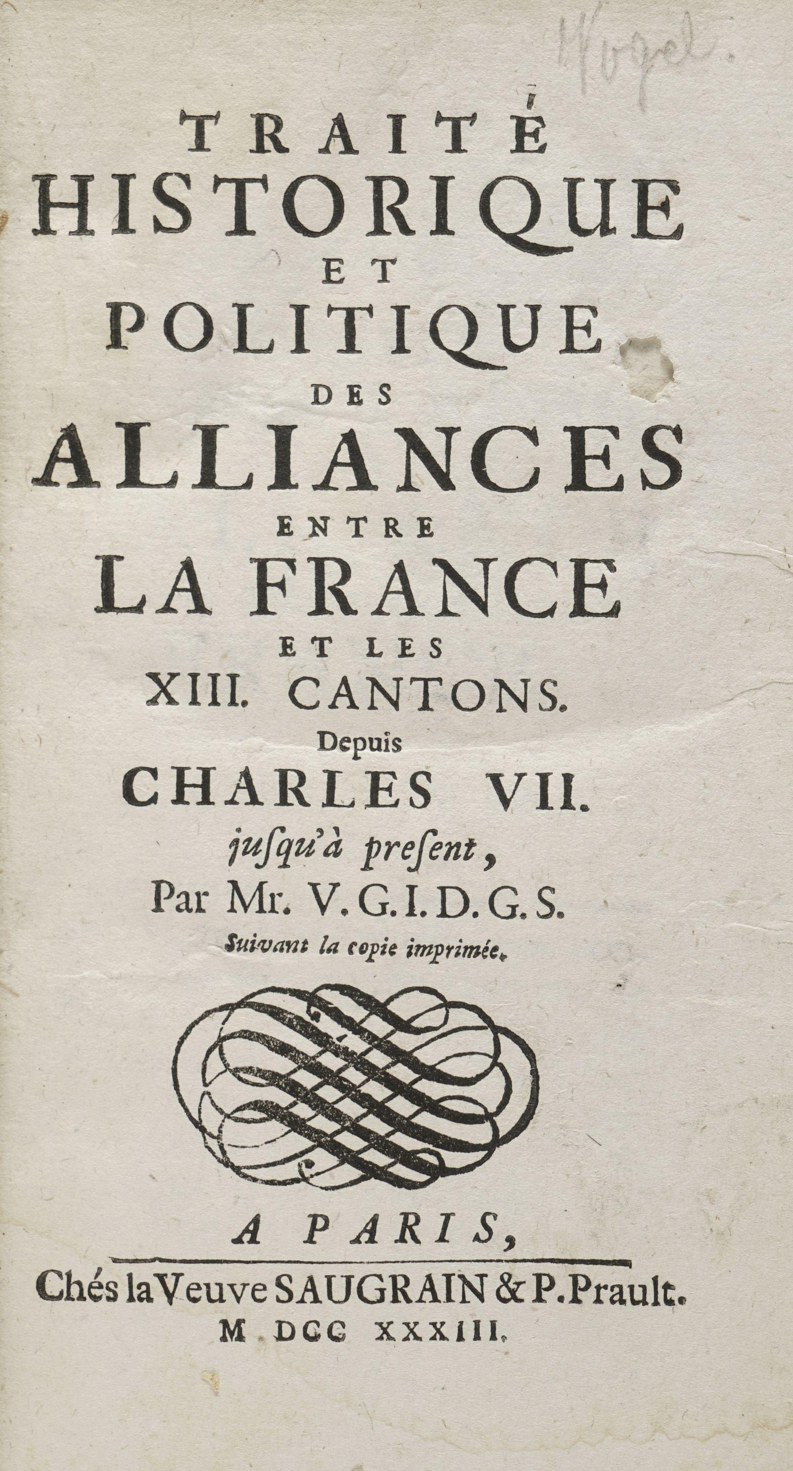 44. VOGEL : Traité Historique et politique des Alliances entre la France et les XIII Cantons, depuis Charles VII jusqu’à présent. Paris, Vve Saugrain, 1733