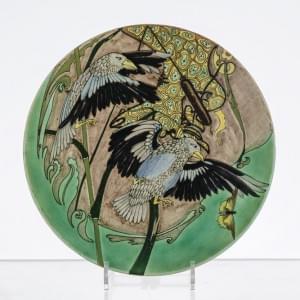 Céramique émaillée vert, jaune et gris, marque de la manufacture...