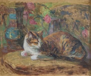 Chat, huile sur toile marouflée sur pavatex, 42x51 cm