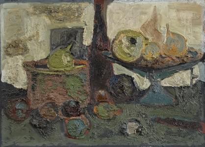 Nature morte à la coupe de fruits, huile sur carton, signée et d...