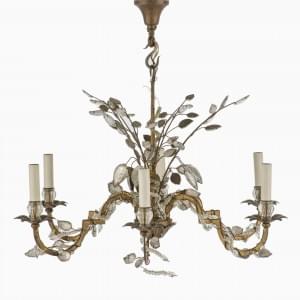 A six lumières, cristal taillé et métal doré à décor de pampille...