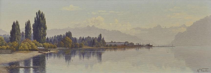 Bord du lac Léman avec le Jura en arrière-plan, huile sur toile,...