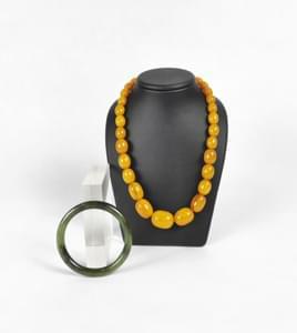 3086. Lot d'un collier de perles d'ambre ovales en chute et d'un brace...