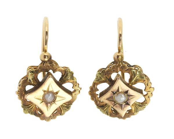 3008. *Paire de dormeuses ajourées serties de demi-perles