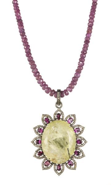 3034. *Pendentif serti d'une améthyste ovale facettée entourée de rubi...