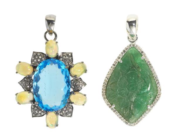 L'un serti d'une émeraude sculptée à motif floral (env. 17 ct) e...