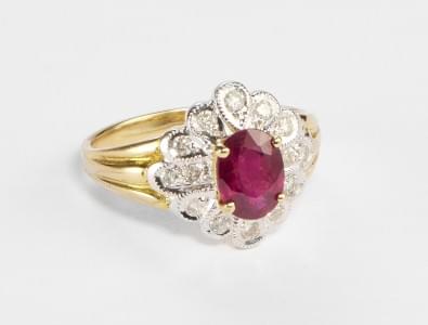 3227. Bague sertie d'un rubis taille ovale (env. 0,9 ct) entouré de di...