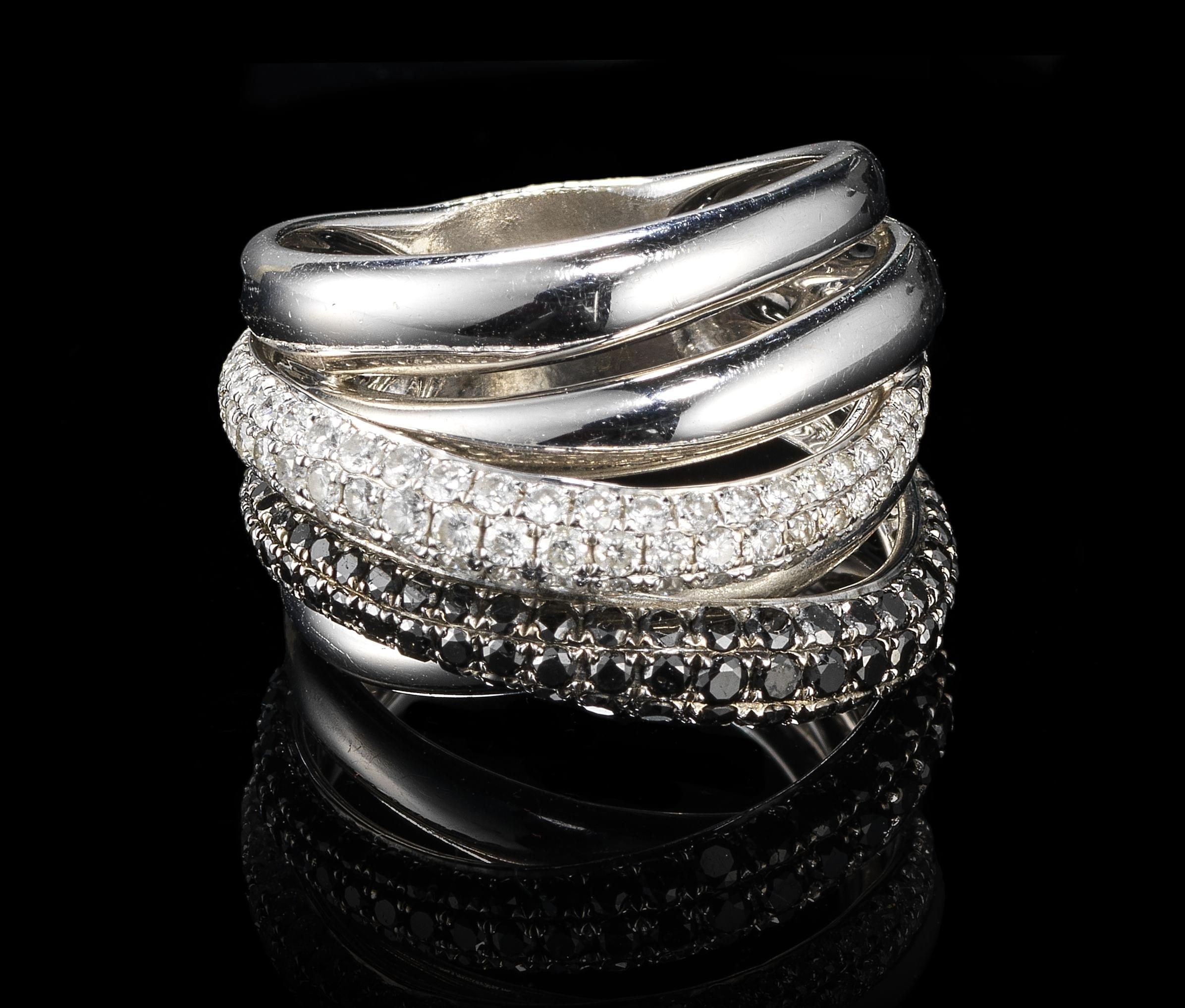 288. Bague multi-anneaux pavée de lignes de diamants et de diamants noirs