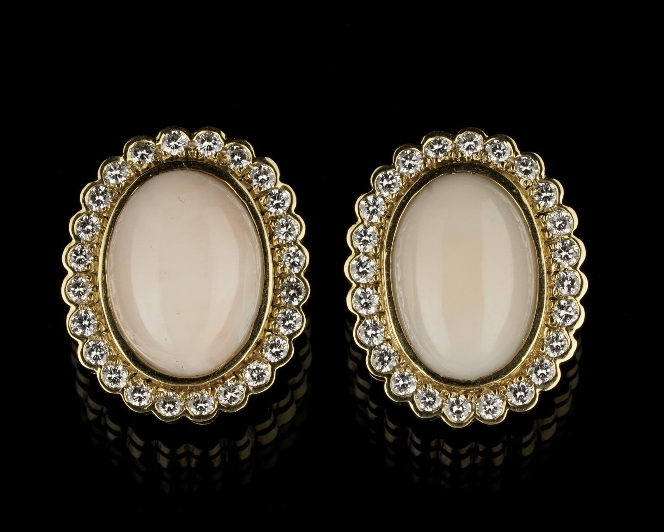 683. Clips d'oreilles sertis de corail en cabochon entourés de diamants