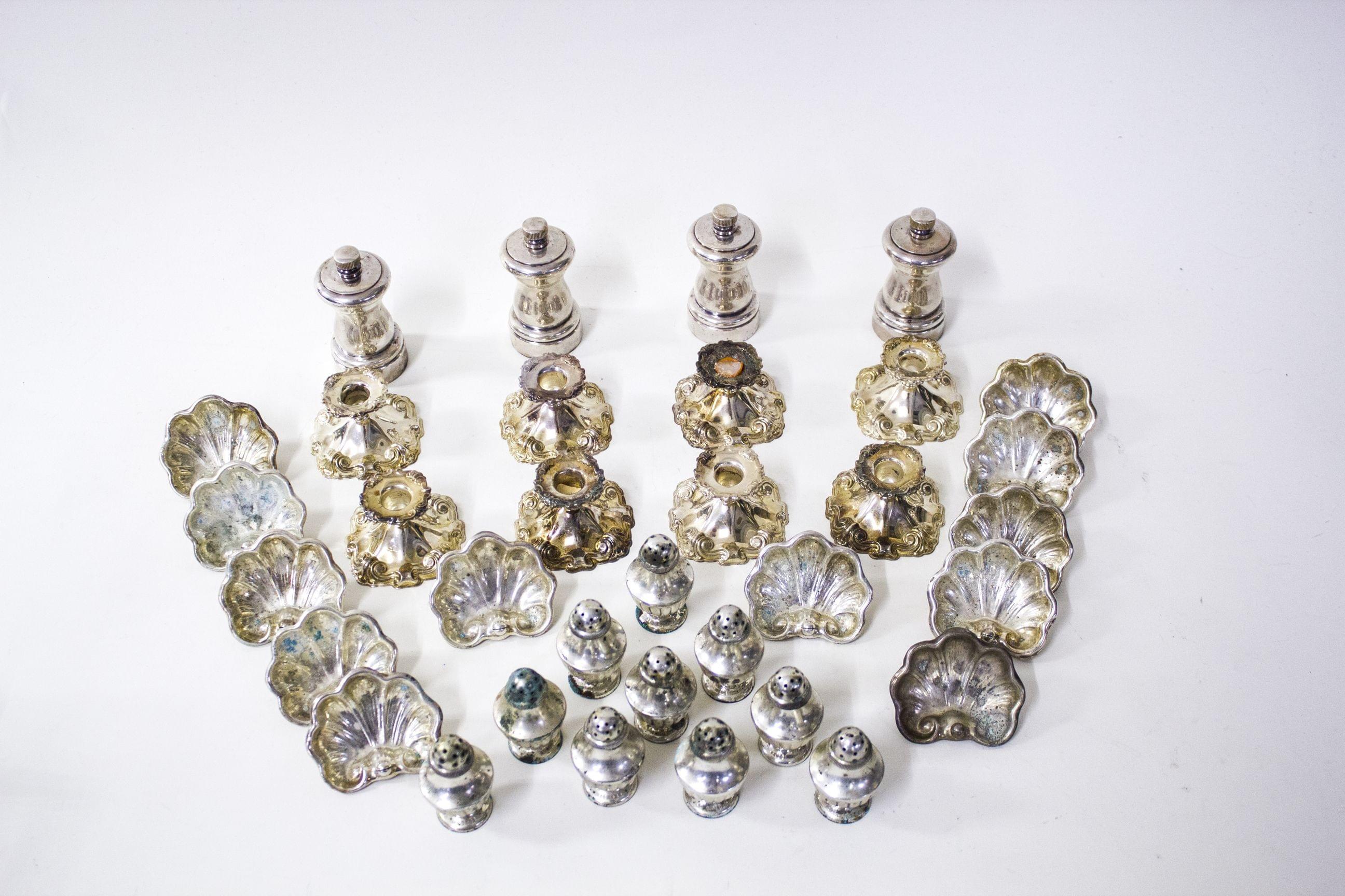 3510. Ensemble de salerons, saupoudroirs, timbales, bougeoirs et moulins à poivre