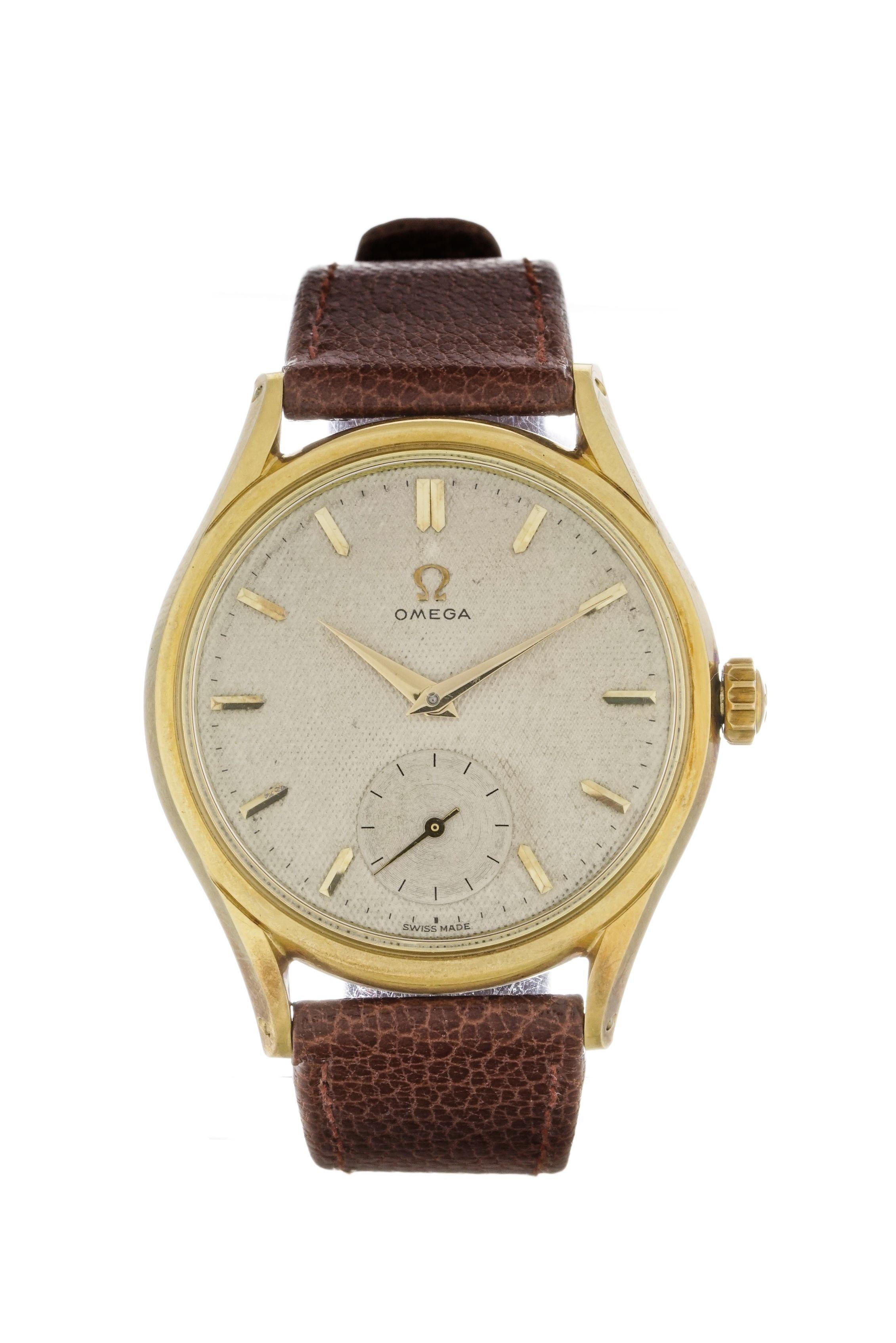 Cadran crème, aiguilles et index bâtons dorés, secondes à 6h, bracelet cuir marron, or 750, 34 mm, poids brut 48 g