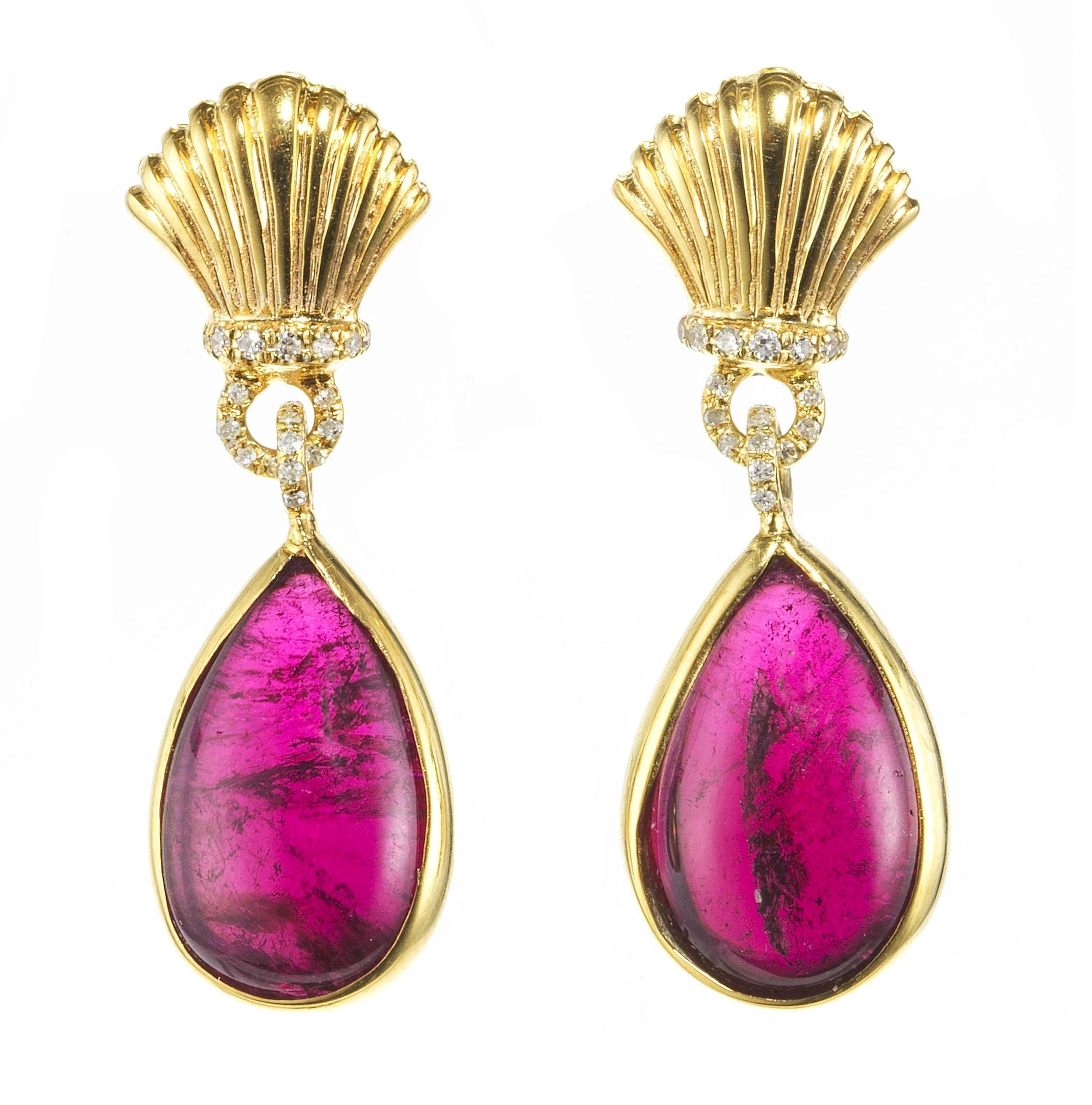 3196. *Pendants d'oreilles retenant une goutte de tourmaline cabochon taille poire rehaussée d'un motif de coquillage et de diamants