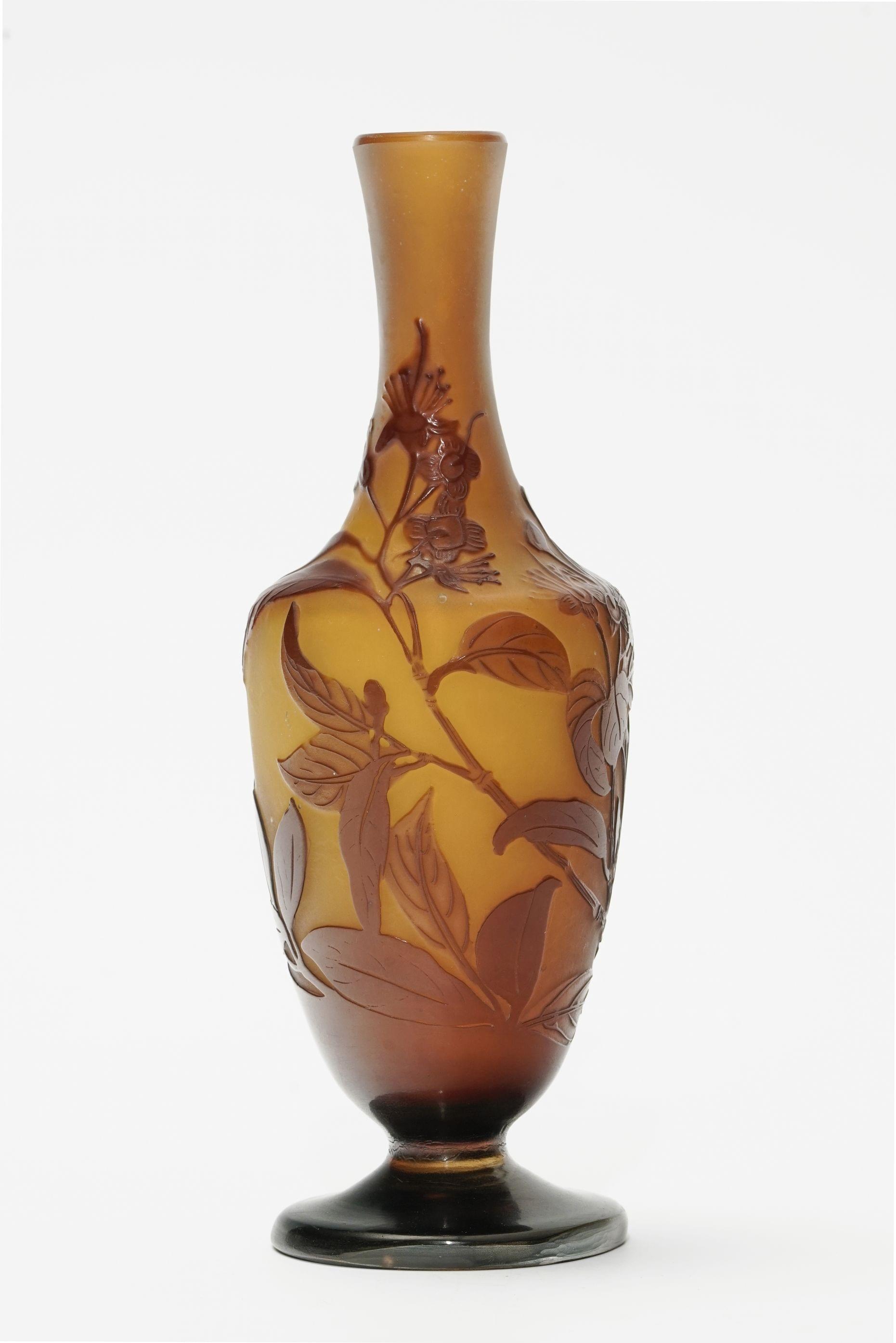Verre multicouche dégagé à l'acide, à décor de fleurs brunes sur fond orangé, H 18 cm