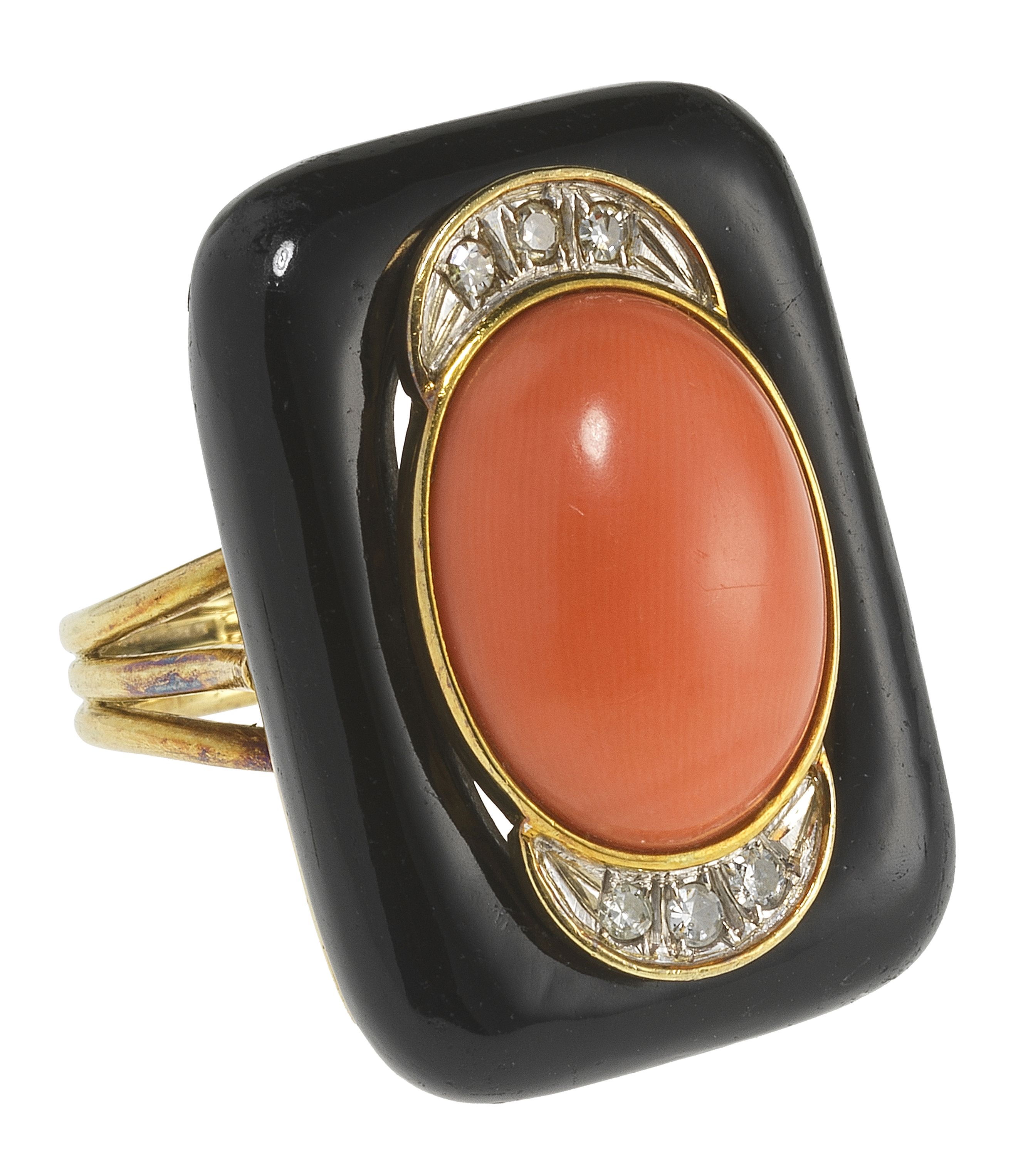 4453. Bague de style Art déco centrée d'un cabochon de corail