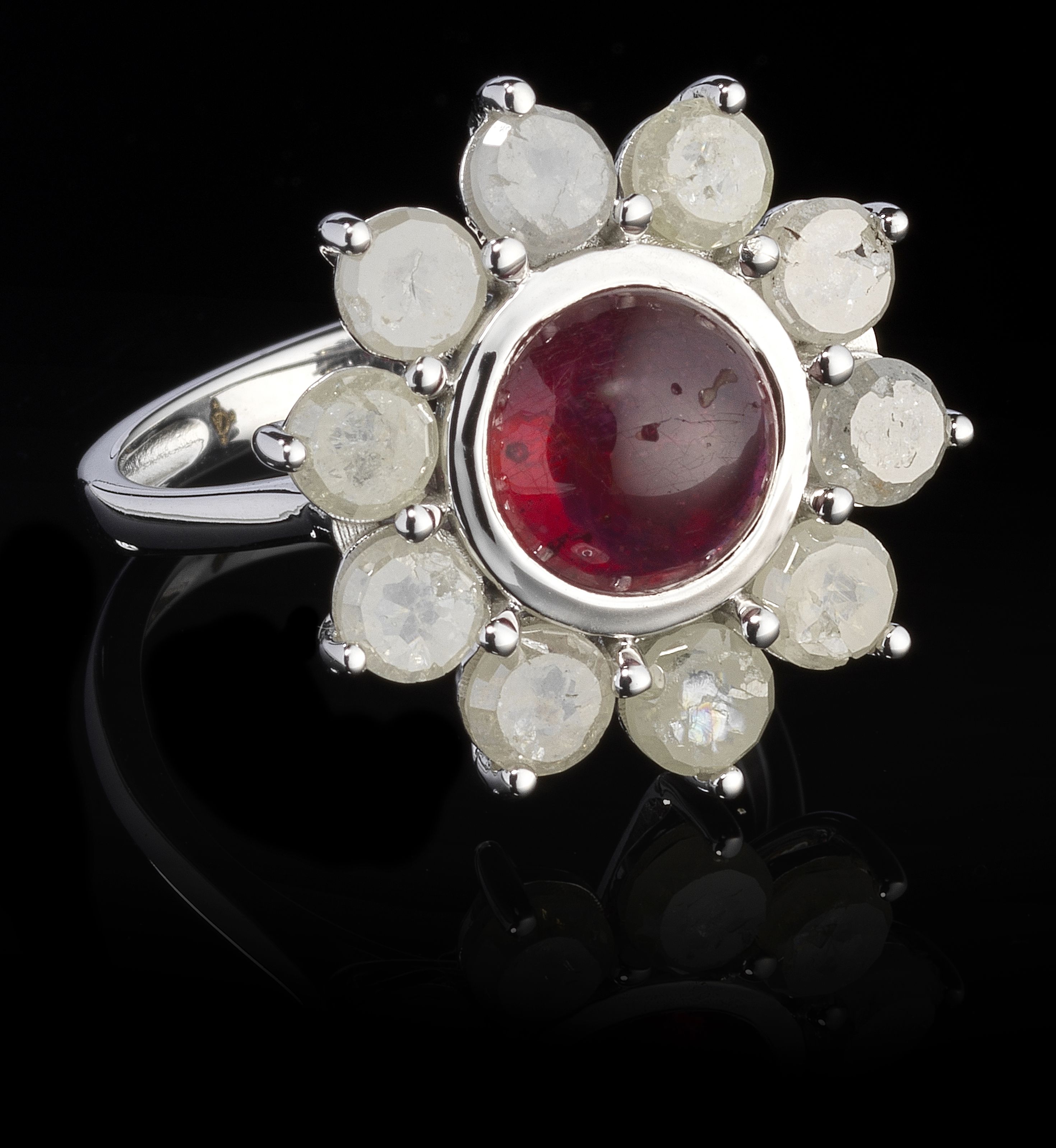 4429. *Bague fleur sertie d'un rubis taille cabochon (env. 3 ct)
