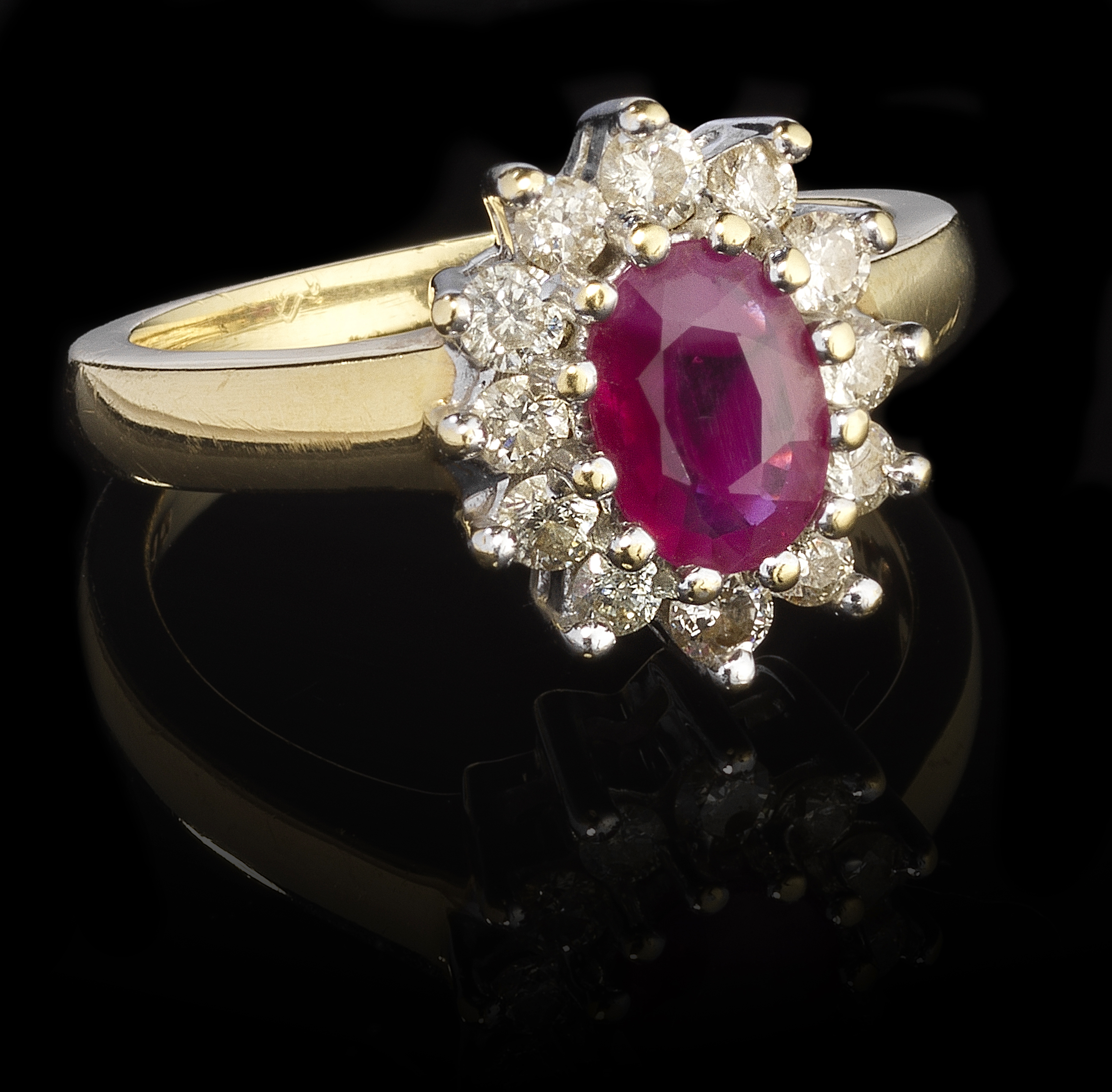 4441. Bague sertie d'un rubis taille ovale (env. 1,05 ct) épaulé de di...
