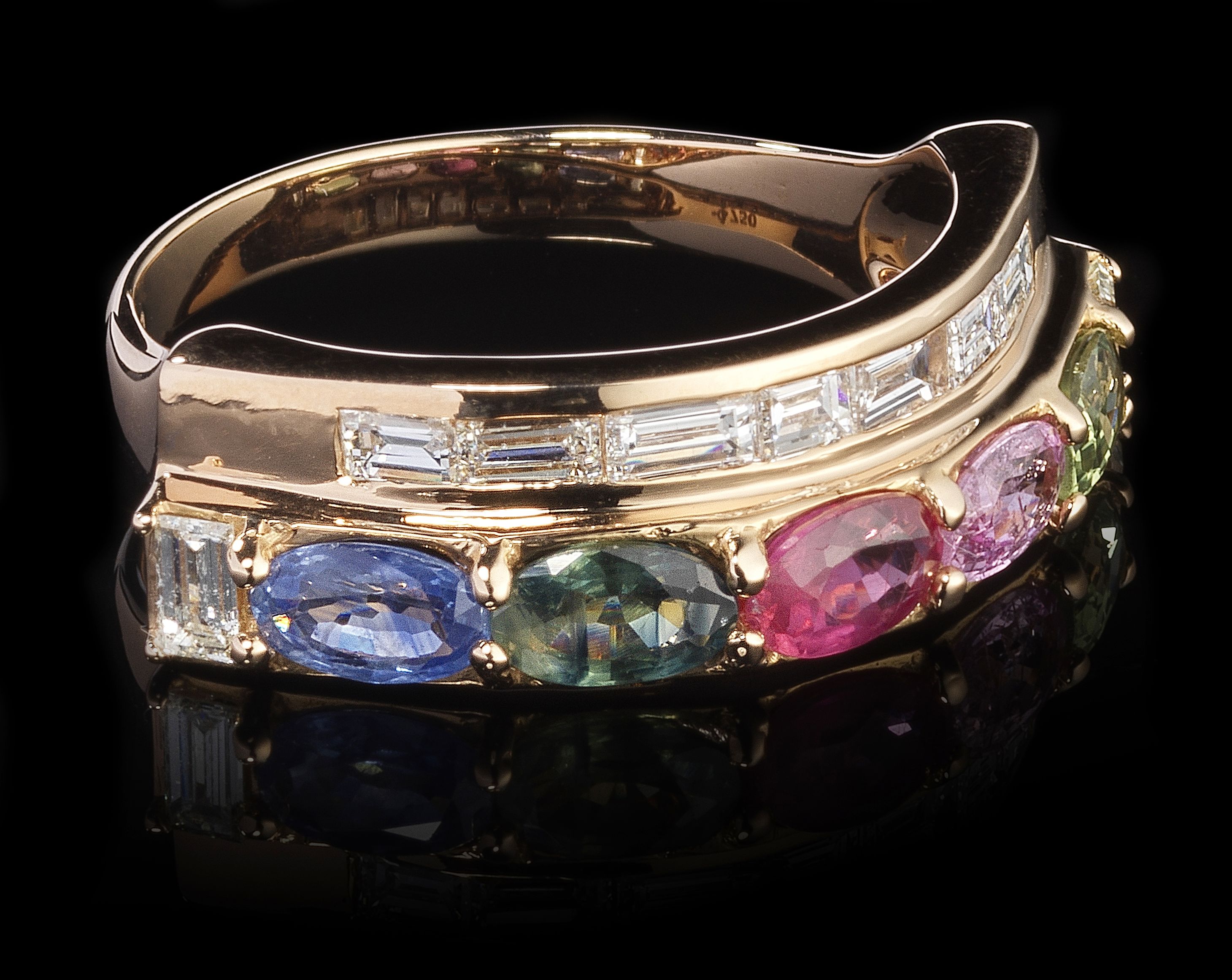 4420. *Bague sertie d'une ligne de saphirs de couleur (env. 1,6 ct) et...