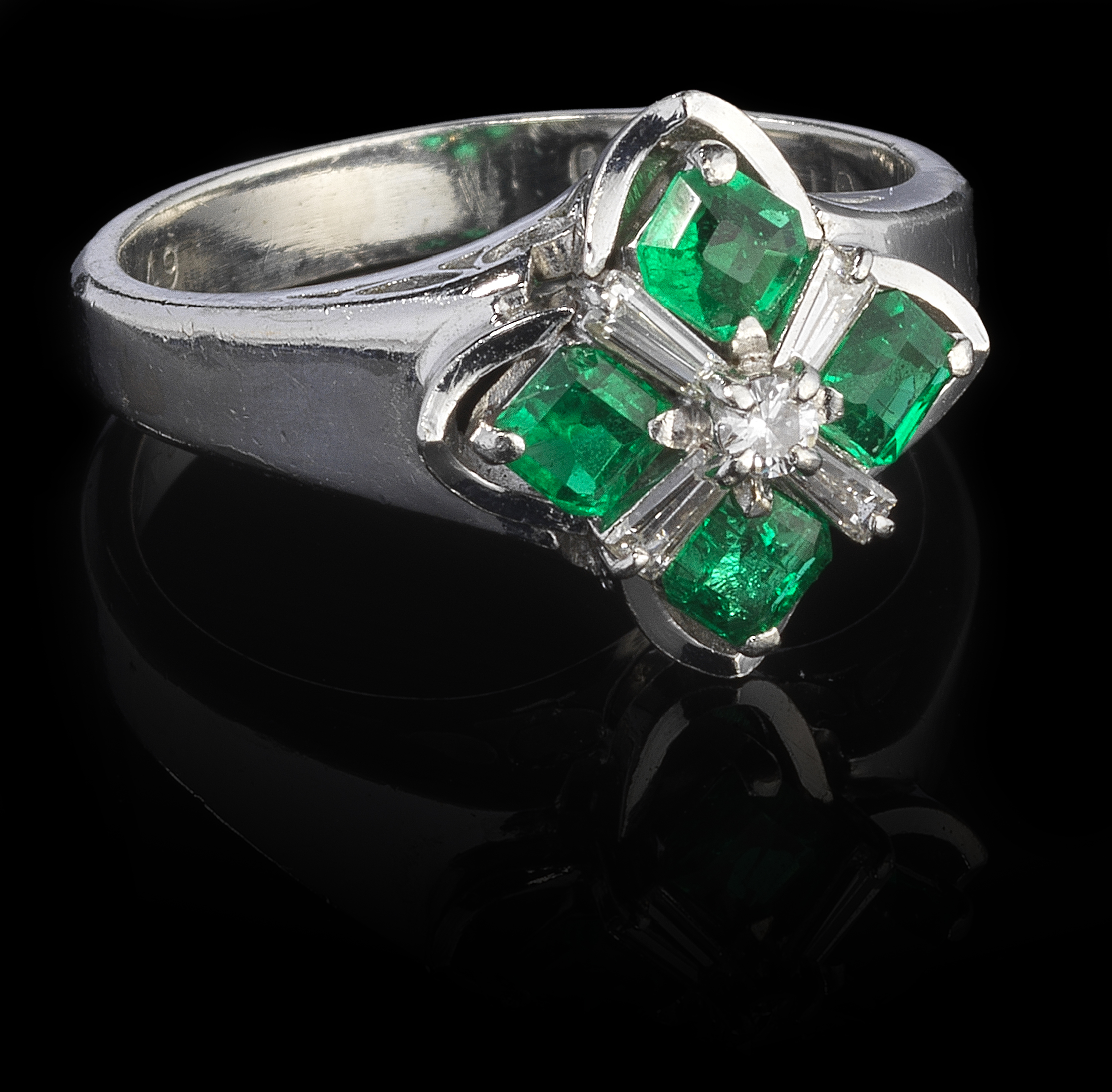 4438. *Bague sertie de quatre émeraudes calibrées (total 0,49 ct)