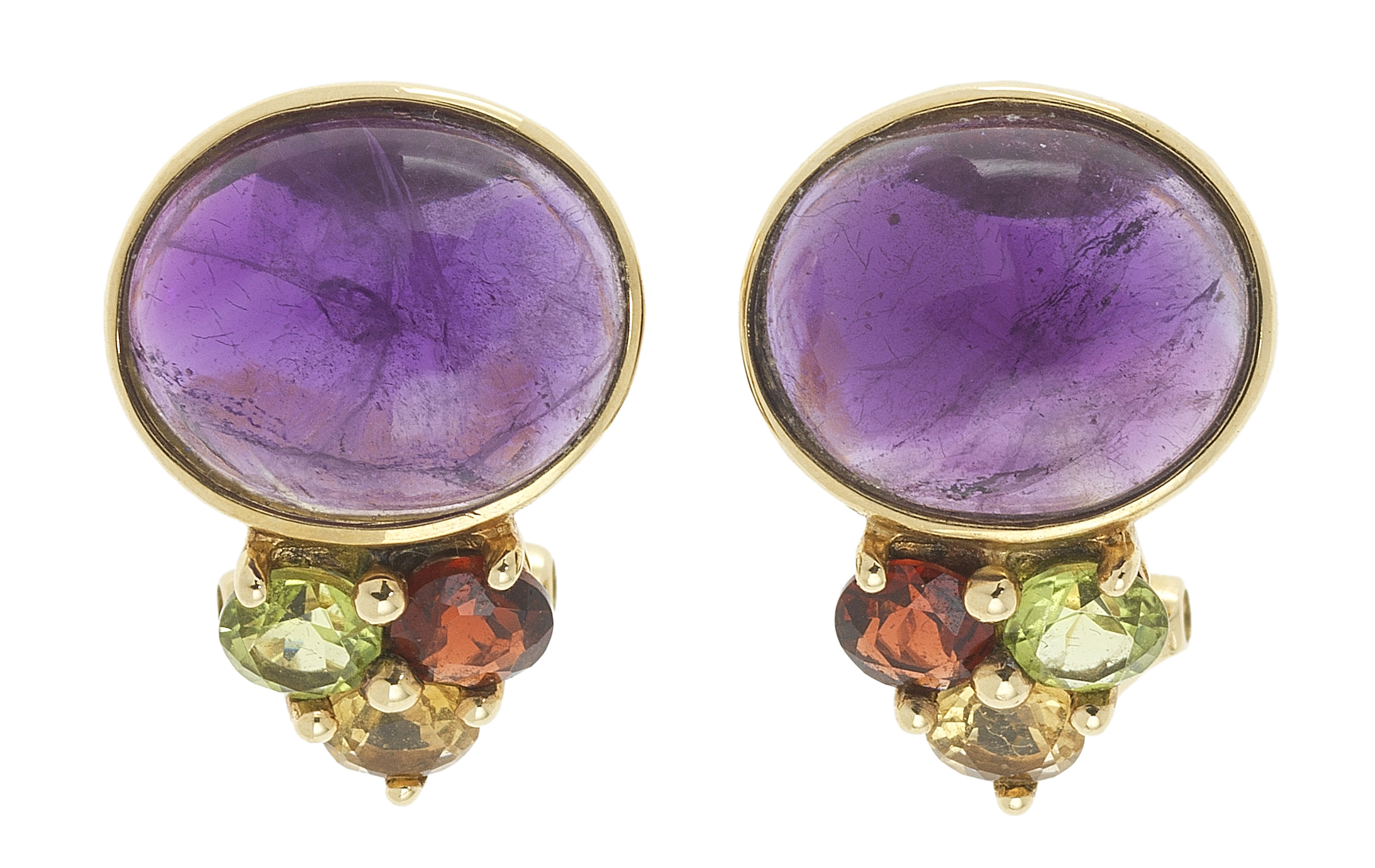 4444. Boucles d'oreilles serties chacune d'une améthyste taille caboch...