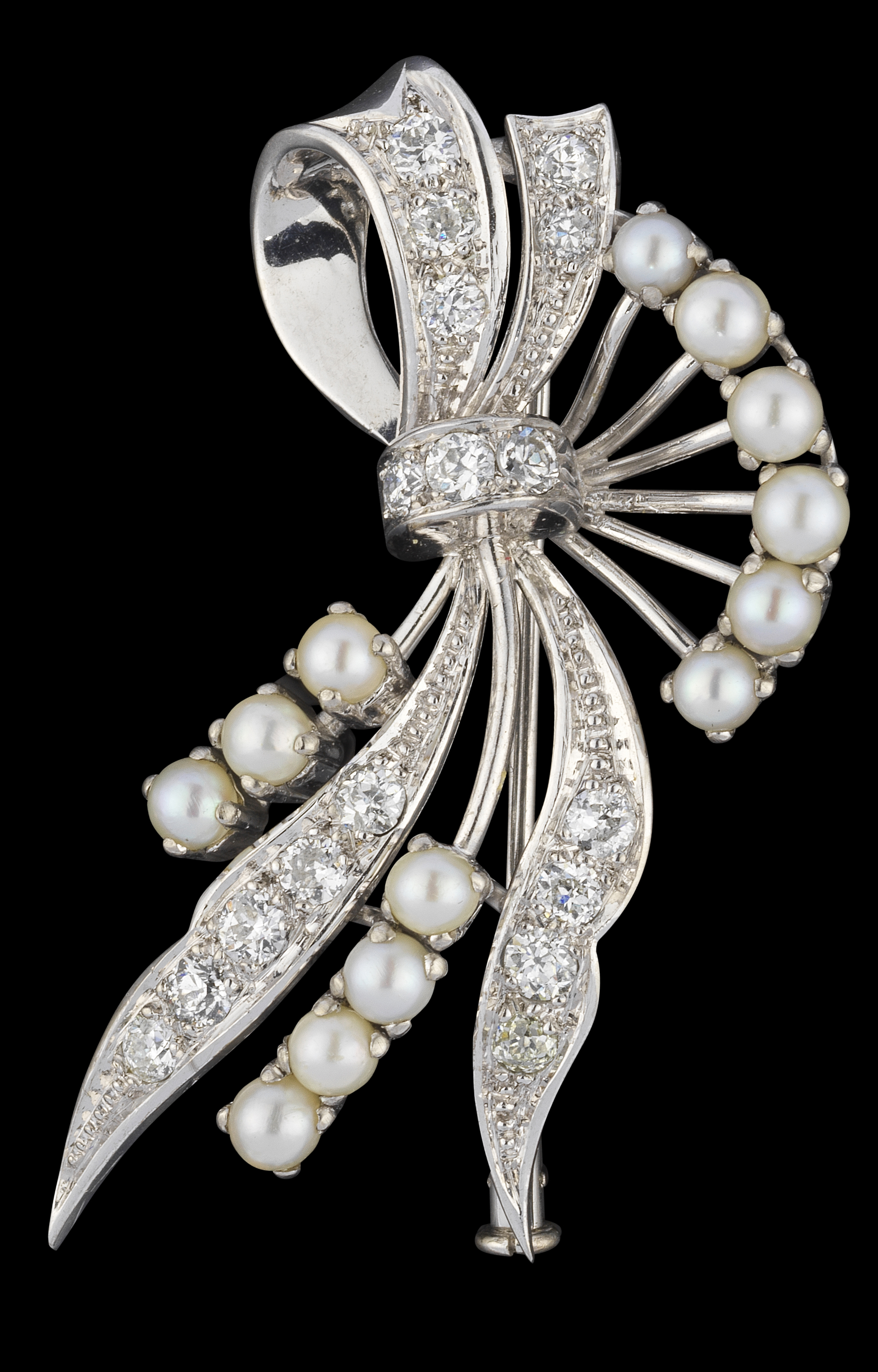 4469. Broche nœud stylisée sertie de perles et de diamants