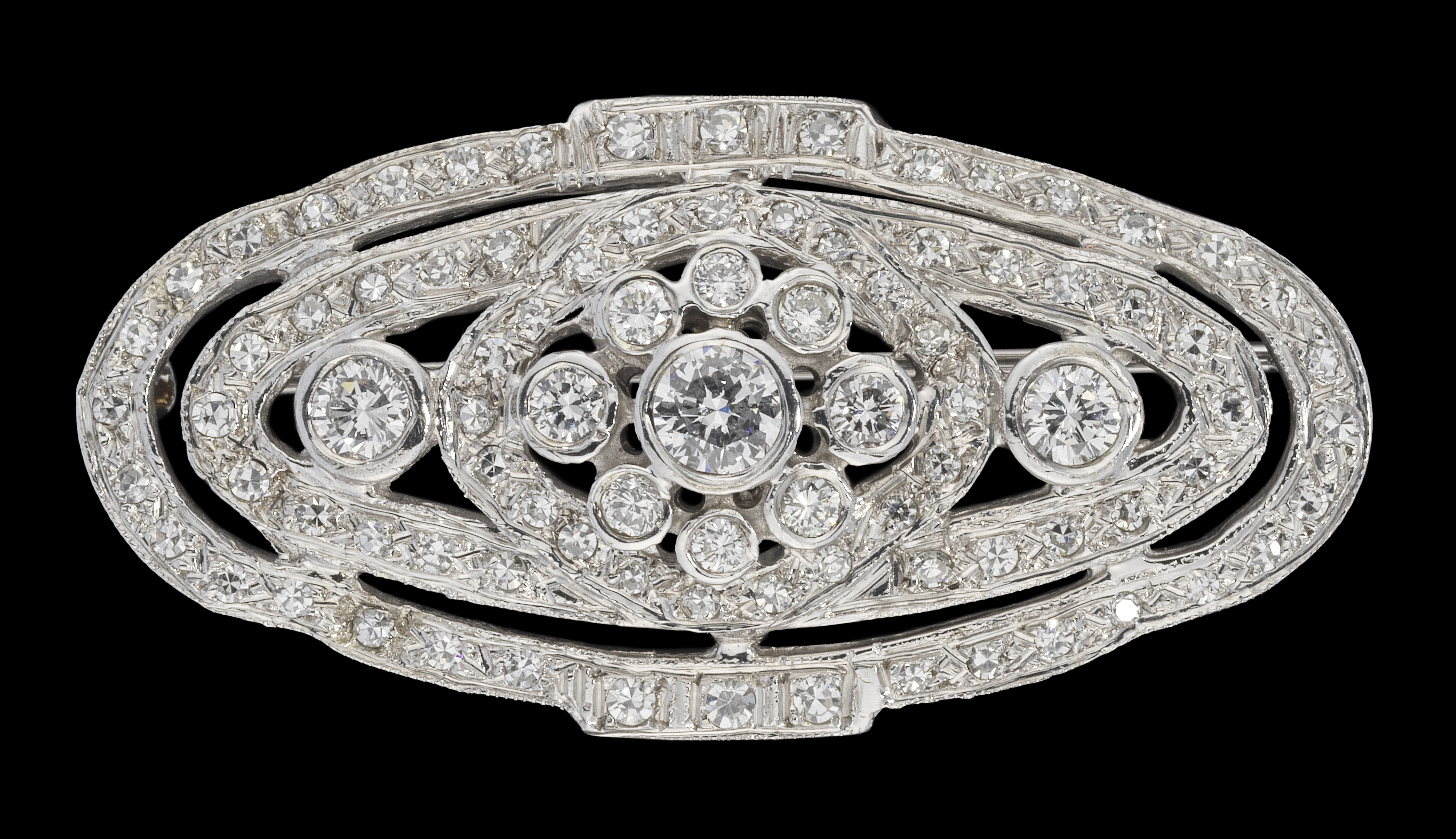 4452. Broche ovale ajourée pavée de diamants taille brillant et 8/8