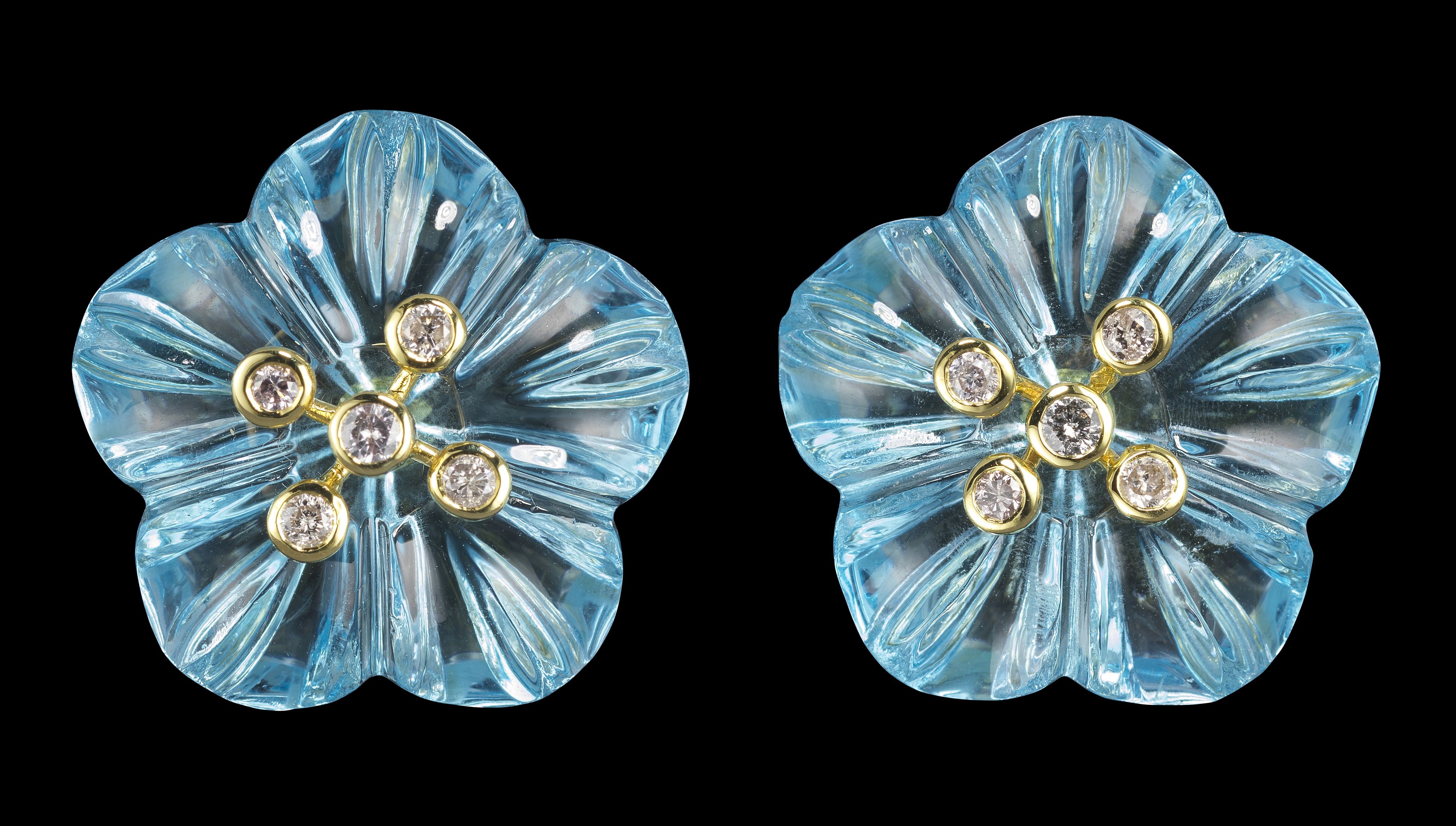 4445. Clous d'oreilles à motifs de fleurs en topazes bleues sculptées