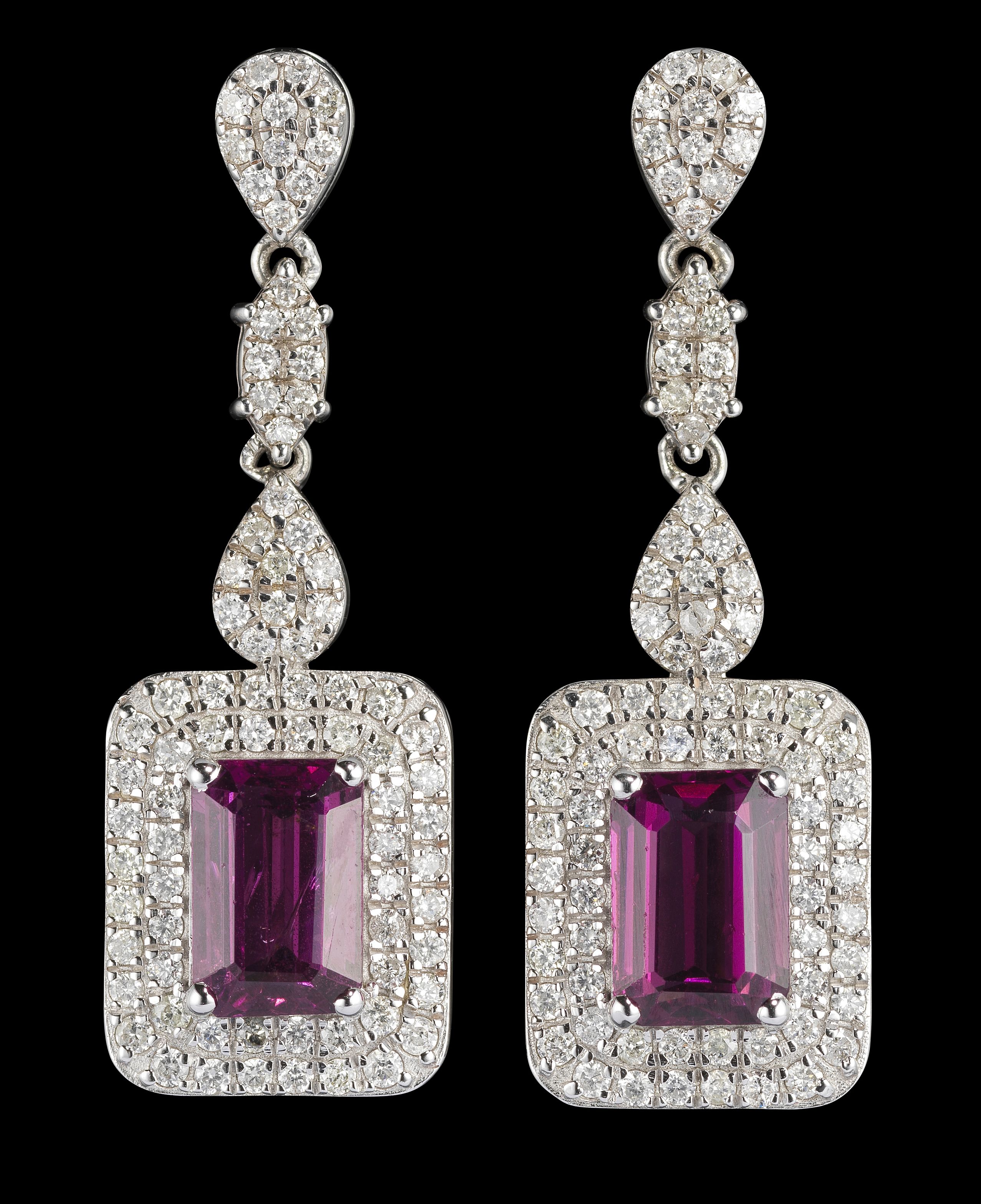 4422. *Pendants d'oreilles retenant chacun une rhodolite taille baguet...