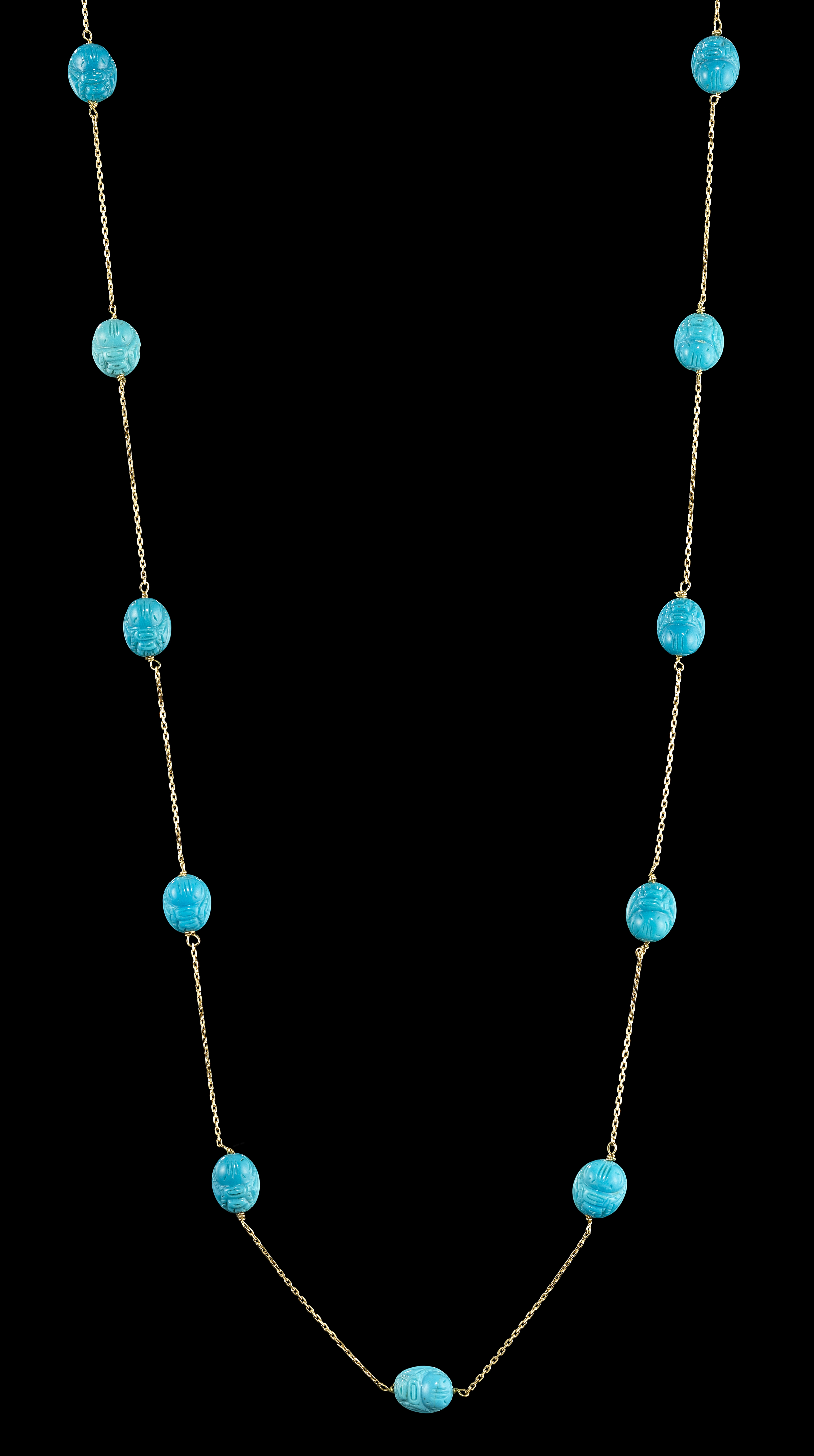 4417. Sautoir à maille forçat ponctué de scarabées en turquoise