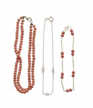 3135. Lot de trois bracelets, l'un de deux rangs de perles de corail,...
