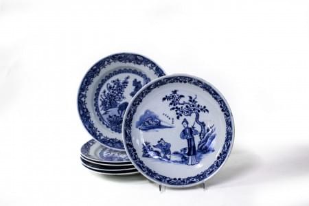 Porcelaine bleu blanc, cinq à décor de daims dans un paysage et...